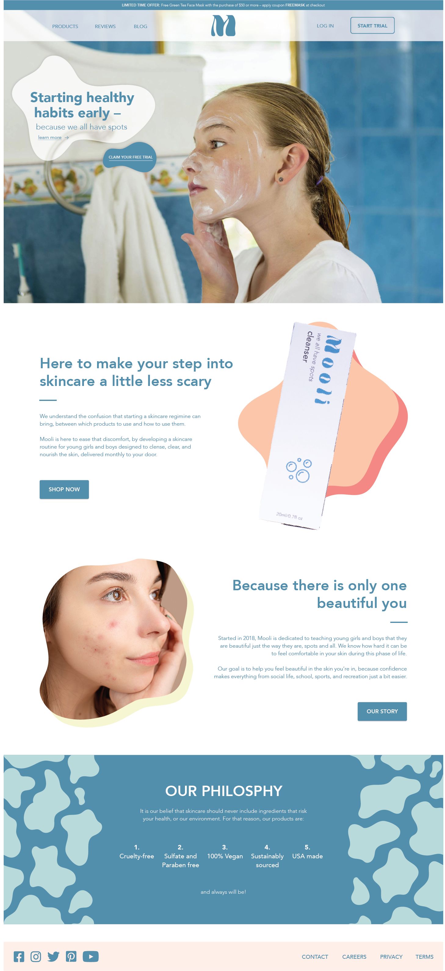 Starting and going through puberty is one of the most difficult experiences in adolescent life, and the development of acne only makes it harder. Mooli was created to cut through the confusion that comes with finding the right products for preteen skin by offering the perfect starting skincare regimen, made with ingredients that leave skin soft, smooth, and clear, by using imagery of cow spots to assure preteens that we all have spots! Mooli also helps to establish healthy habits and encourages self-love regardless of your appearance.